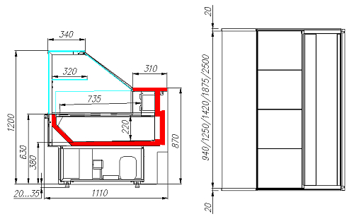 • Базовая комплектация витрины – без боковин, боковины докупаются отдельно.