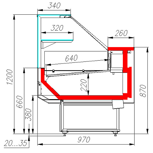 Модель оснащена регулируемыми ножками высотой от 20 до 35 мм. Поверхность выкладки, столешница, сменная передняя панель, кронштейны и обшивка светильника выполнены из нержавеющей стали, боковины - из черного пластика, опорная стойка - из нержавеющей трубы, панели машинного отделения - из стали, фактурированной под дерево.