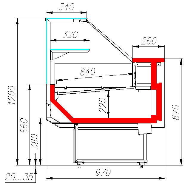 Модель оснащена регулируемыми ножками высотой от 20 до 35 мм. Поверхность выкладки и столешница выполнены из окрашенной стали, боковины - из пластика, опорная стойка, кронштейны и обшивка светильника - из нержавеющей стали.