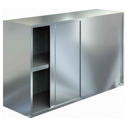 Полка настенная (навесная) сварная закрытая с дверями-купе, сплошной промежуточной полкой изготовлена из нержавеющей стали 430 толщиной 1мм (уголки крепления, задняя стенка) и 0,7мм (полка, каркас). Полка предназначена для длительного хранения посуды и инвентаря в закрытом пространстве на профессиональной кухне предприятий общепита. Двери-купе позволяют экономить пространство, так как перемещаются на роликах, а не распахиваются, приводя к уменьшению полезной площади кухни.