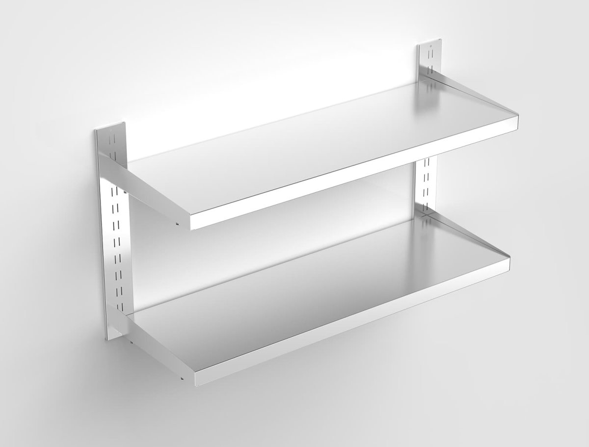 Полка имеет два уровня со сплошными горизонтальными несущими поверхностями. Конструкция разборная из нержавеющей стали AISI 430 толщиной 0,8 мм. К стене крепится при помощи кронштейнов.