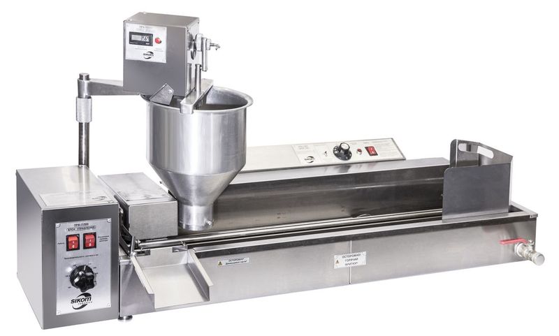 Пончиковый аппарат Сиком ПРФ-11/900 (D36) с электромеханической панелью управления, 1 ванной и делителем-дозатором используется на предприятиях общественного питания и торговли для формирования и приготовления в разогретом масле (фритюре) пончиков. Аппарат формирует и отсаживает по одному пончику в ручей. Ванна имеет кольцевое движение фритюра. Переворот и выгрузка пончиков осуществляется автоматически. Пончиковый аппарат оснащен плунжерной парой, позволяющей изготавливать пончики массой - 35-55г. Привод дозатора пончиковго аппарат оснащен счетчиком с фискальной памятью, что позволяет управлять автоматом в нескольких режимах. Новое устройство позволяет контролировать работу автомата при многосменной работе. Каждый оператор получает свой PIN-код, а технолог/администратор имеет возможность получать ежедневные/еженедельные выписки об изготовленной на автомате продукции. Кроме того, технолог/администратор, имея собственные коды доступа, может контролировать ресурс фритюра, своевременно обновлять его, что, несомненно, улучшит качество производимых пончиков. Пончиковый аппарат изготовлен из высококачественной нержавеющей стали, делитель-дозатор из пищевого алюминиевого сплава. Поддон для выгрузки пончиков в комплект не входит. Для приготовления пончиков другого диаметра необходимо дополнительно приобрести сменную плунжерную пару требуемого диаметра (плунжер и втулку по отдельности).