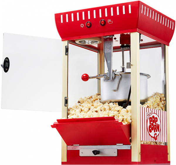 Попкорн аппарат Enigma D469 (8OZ SS KETTLE Without Cart) настольный, без тележки, имеет котёл из нержавеющей стали, боковые панели из закалённого стекла, корпус из АБС-пластика, подсветку, сборник нераскрывшихся зерён, главный выключатель.