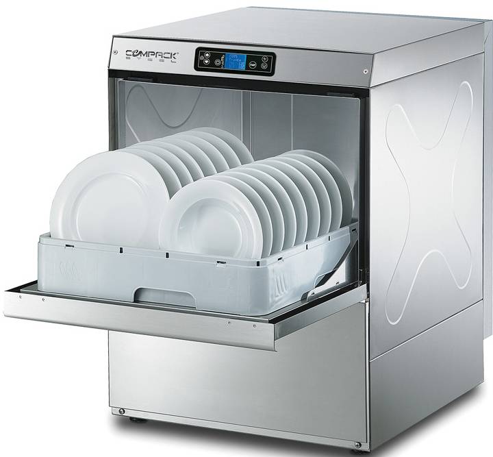 Фронтальная посудомоечная машина COMPACK X56E-01 EXUS используется в кафе, ресторанах и других заведениях общепита для мытья стаканов, тарелок, кружек и столовых приборов. Это оборудование имеет два насоса (мойки и слива), четыре цикла мойки (90-110-120-300 сек) при темпрературе воды 55 °С, электронную панель управления, двойной дозатор моющего средства и электрический ополаскиватель, производительность: 720-216 тарелок в час диаметром 350 мм, 40 кассет в час размером 500х500 мм, 1000-300 стаканов высотой 310 мм и диаметром 89 мм, а также вмещает гастроёмкость GN 1/1. Машина комплектуется двумя держателями для приборов, корзиной для стаканов 500х500х100 мм и корзиной для 18 тарелок 500х500х100 мм. Дополнительно можно приобрести: комплект двойных стенок для термозвукоизоляции и верхнюю панель, сливной насос 40 Вт, ТЭН бойлера 9 кВт, наклонную корзину для винных бокалов 500х500х170 мм, регулируемые ножки из нержавеющей стали 50-70 мм, насос давления 0.5 Нр, модульную корзину для винных бокалов 500 мм, ТЭН бойлера 5.4 кВт, комплект фильтров для ванны из нержавеющей стали и корзину для противней с четырьмя делениями 500х500х200 мм.