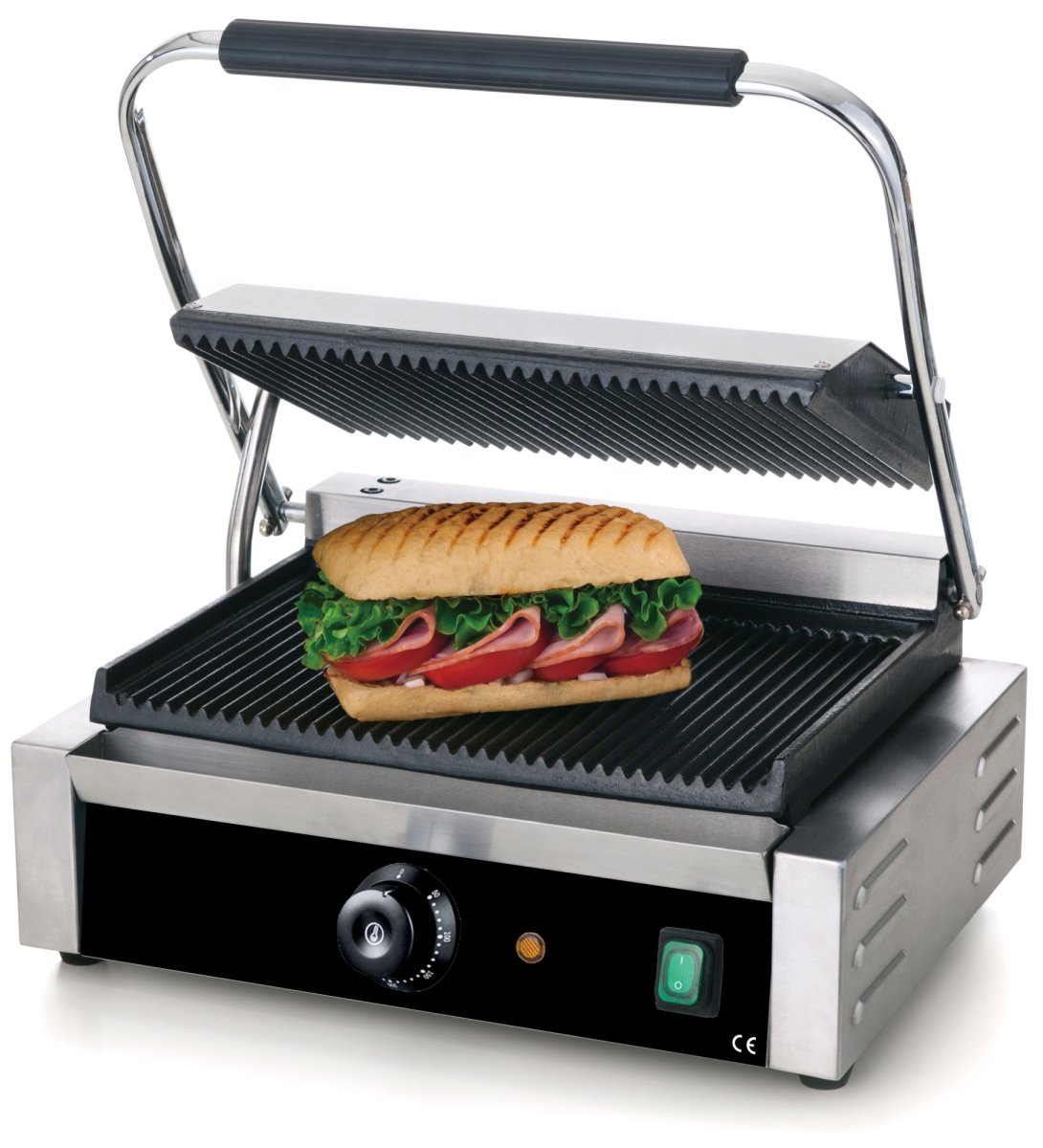 Пресс-гриль Gastrorag NPL-EGD14E - это компактная и недорогая техника для приготовления блюд на профессиональной кухне. С помощью контактного электрогриля можно быстро приготовить аппетитные горячие бутерброды панини, колбаски, овощи-гриль, бургеры, стейки и многое другое. Гриль для мяса оснащен двумя несъемными рифлеными панелями из чугуна с антипригарным покрытием, которые обеспечивают равномерный нагрев продуктов без подгорания. Размер панели 340х220х20 мм. Благодаря двухстороннему нагреву время жарки в электро гриле сокращается примерно на 30%. Верхняя панель снабжена удобной термоизолированной ручкой, с помощью которой легко поднимается и устойчиво держится в любом положении, а также «плавающим» креплением, которое позволяет подстроиться под толщину продукта. Рифление создает более щадящий режим жарки по сравнению с гладкой поверхностью. Кроме того, излишки жира стекают в канавки и могут быть удалены в лоток-жиросборник. Это делает мясные блюда, приготовленные на гриле барбекю, более полезными. Обжаренные продукты приобретают характерный для гриля полосатый рисунок. В комплект входит специальная щетка для очистки панелей. Корпус грильницы изготовлен из нержавеющей стали.