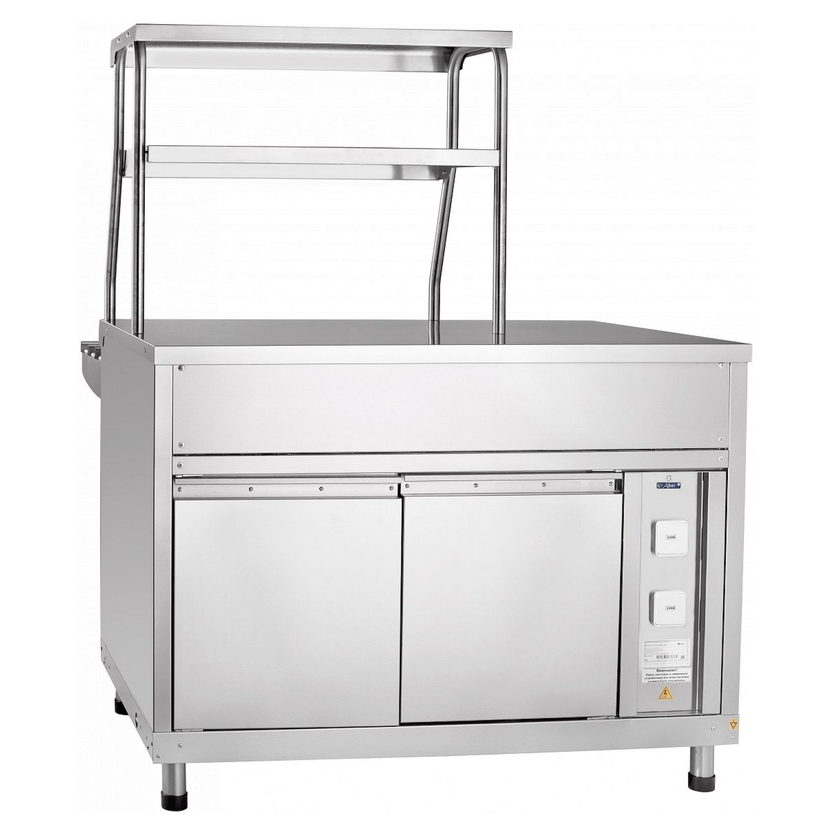 Над прилавком для горячих напитков Abat ПГН-70КМ установлена двухъярусная полка с лампой подсветки. На нее можно выкладывать порционные блюда и напитки. Внизу прилавка расположен нейтральный шкаф, в котором можно хранить различный кухонный инвентарь. В комплект поставки входят направляющие для подносов. Ножки прилавка регулируются по высоте.