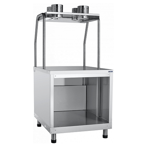 Прилавок для столовых приборов Abat (Чувашторгтехника) ПСП-70КМ используется для хранения и раздачи подносов и столовых приборов на предприятиях общественного питания и торговли. Прилавок для столовых приборов содержит четыре перфорированных нержавеющих стакана для вилок, ложек и ножей.