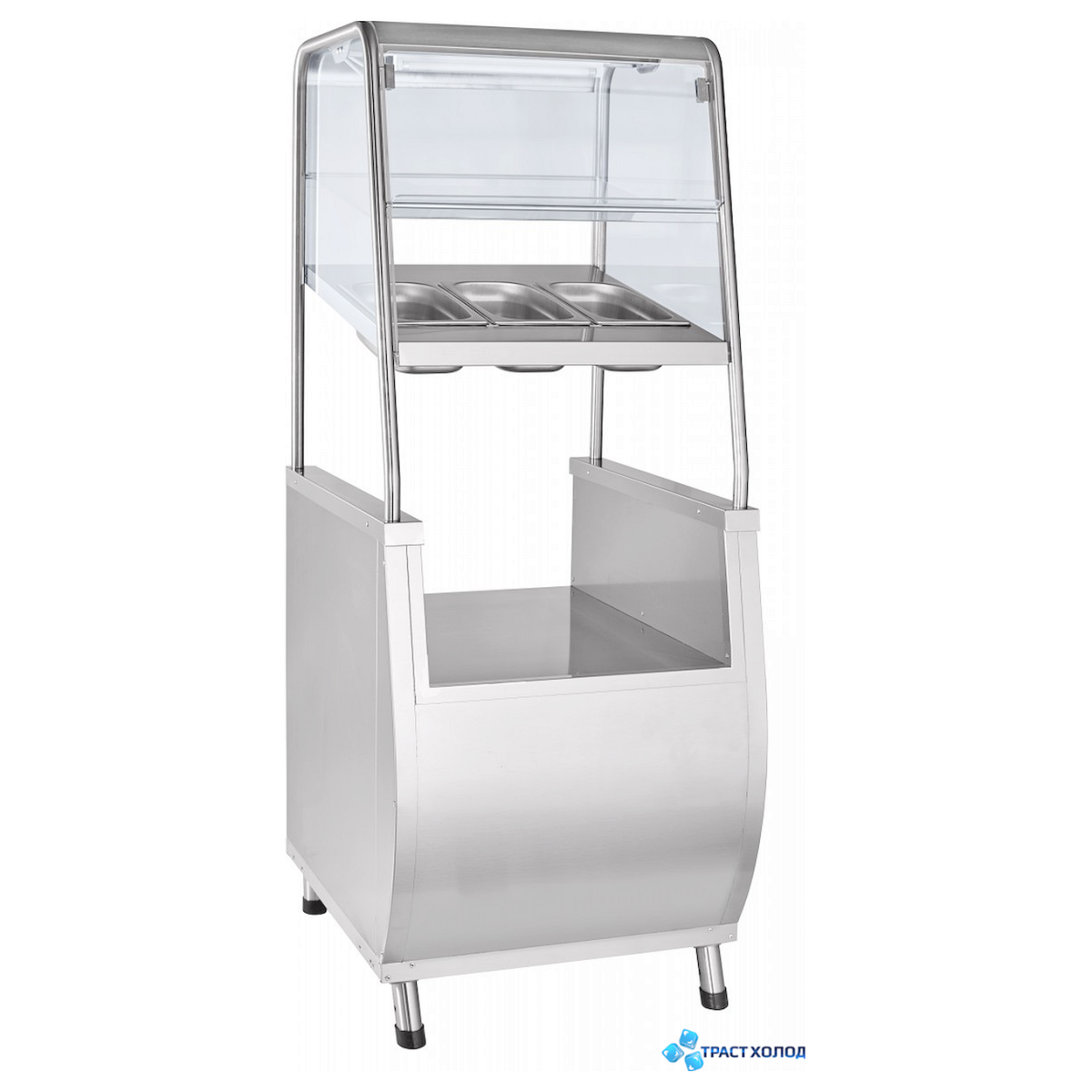 Для дополнительных подносов и прочего инвентаря внизу прилавка расположен закрытый отсек. Ножки прилавка для столовых приборов регулируются по высоте.