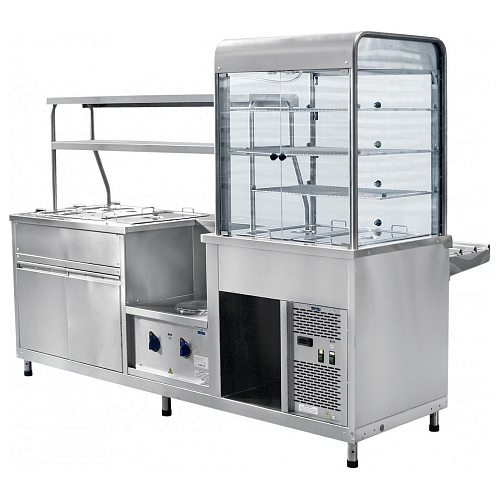 Конструкция прилавка-витрины состоит из трех составных частей: мармита первых блюд, мармита вторых блюд, а также холодильной витрины. Последняя используется для быстрого и эффективного охлаждения напитков и блюд, мармиты – для постоянного поддержания высокой температуры приготовленных блюд. В камере витрины имеется система освещения, обеспечивающая отличную демонстрацию товаров покупателям. Охлаждение в камере витрины ведется в температурном диапазоне от +1 до +10 °С.