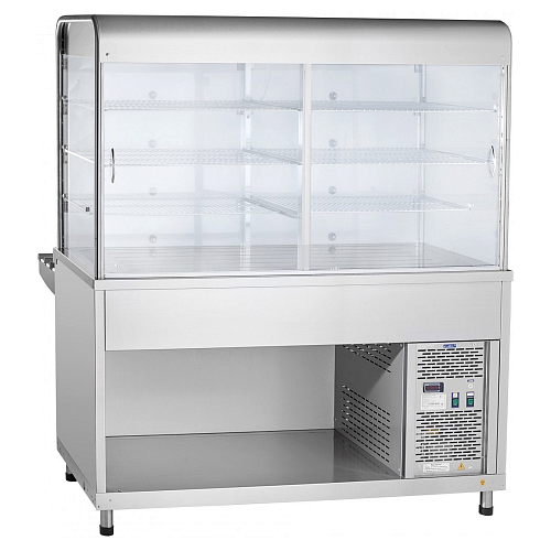 Прилавок-витрина оснащен лампой подсветки и принудительной циркуляцией охлажденного воздуха. Внизу прилавка-витрины расположен открытый нейтральный шкаф для хранения кухонного инвентаря.