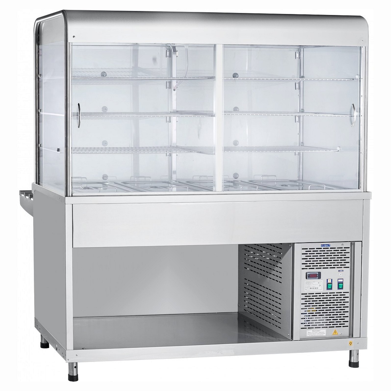 Прилавок-витрина оснащен лампой подсветки и принудительной циркуляцией охлажденного воздуха. Внизу прилавка-витрины расположен открытый нейтральный шкаф для хранения кухонного инвентаря.