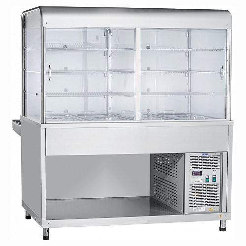 Закрытая охлаждаемая витрина прилавка-витрины имеет большую полезную площадь. Она используется для выкладки блюд и напитков. Основание витрины представляет собой охлаждаемую ванну с набором гастроемкостей, предназначенных для хранения салатов.