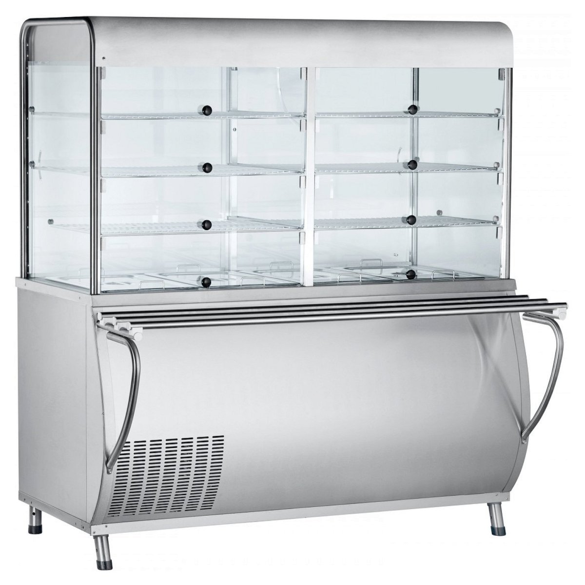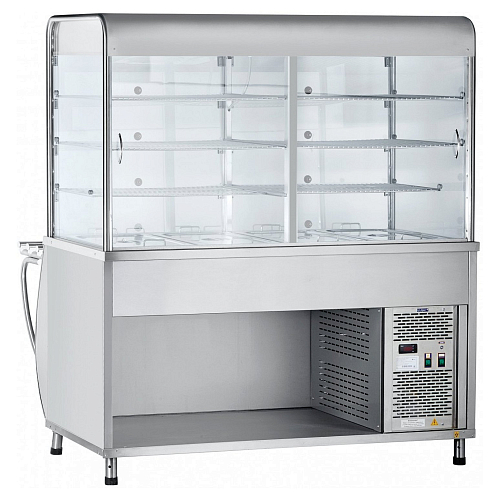 Закрытая охлаждаемая витрина прилавка имеет большую полезную площадь и используется для выкладки блюд и напитков. Основание витрины прилавка представляет собой охлаждаемую ванну с набором гастроемкостей, предназначенных для хранения салатов.