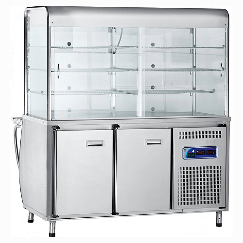 Закрытая охлаждаемая витрина прилавка имеет большую полезную площадь и используется для выкладки блюд и напитков.