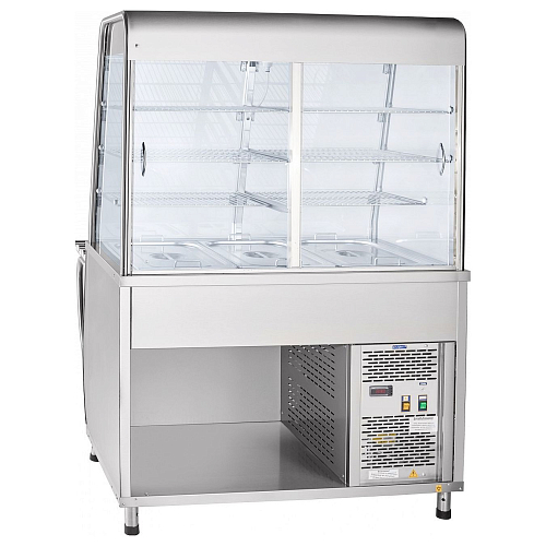Закрытая охлаждаемая витрина прилавка имеет большую полезную площадь и используется для выкладки блюд и напитков. Основание витрины прилавка представляет собой охлаждаемую ванну с набором гастроемкостей, предназначенных для хранения салатов.