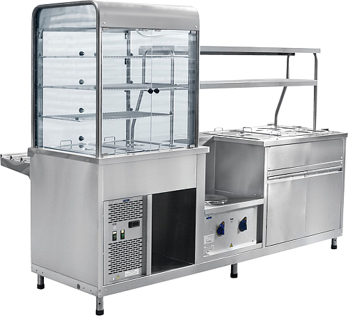 Этому способствует наличие холодильной витрины и мармитного отдела для первых и вторых блюд.