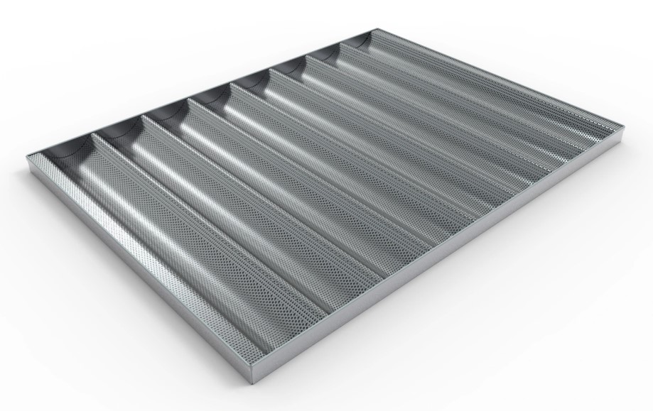 Противень алюминиевый багетный WLBake с перфорацией (8 волн 600 мм) размером 800х600 мм для расстоечной камеры WLBake серии PF находит применение в заведениях общественного питания и пекарнях для изготовления багетов.