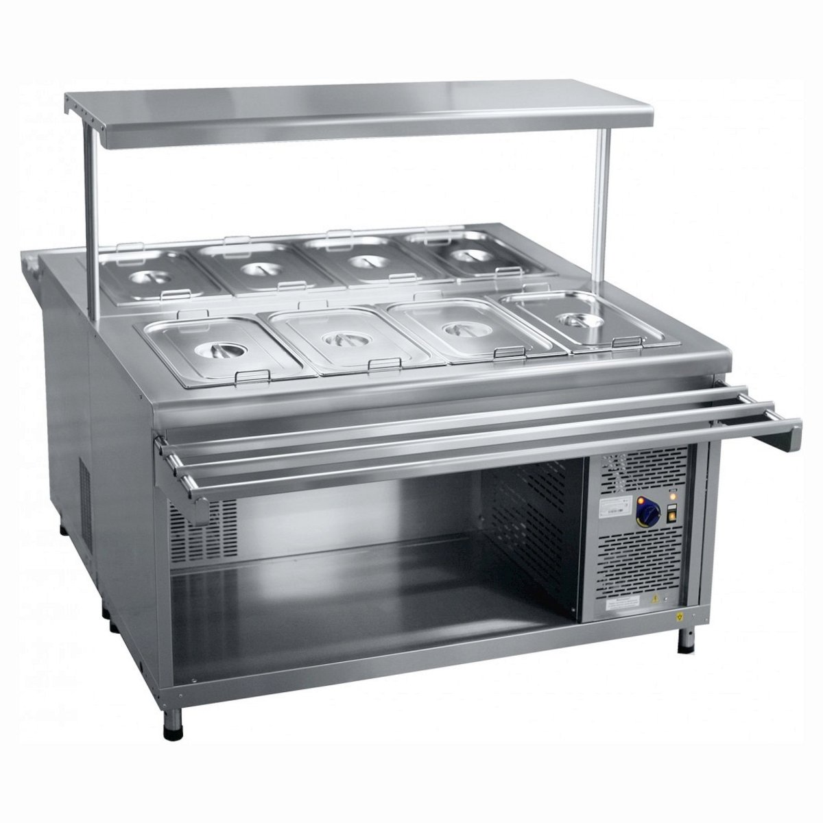 Одна полка с лампой посветки. Охлаждаемая столешница. 8 гастроемкостей типоразмера GN 1/1 установлены в столешнице в 2 ряда (по четыре гастроемкости).