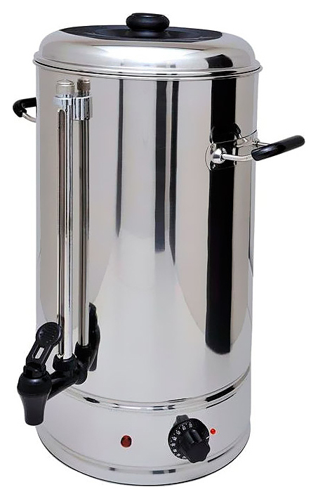 Кипятильник воды Rosso WB-10 хорошо подойдет для небольших кафе, баров, кейтеринга, точек уличной торговли. Предназначен для быстрого получения кипяченой воды. Обеспечивает непрерывный нагрев воды. Не требует подключения к водосети. Корпус аппарата выполнен из шлифованной нержавеющей стали. С двух сторон емкости расположены ручки из термоизоляционного материала, что дает возможность удобно переносить аппарат без риска получения ожога. Термостат позволяет довести воду до кипения, а затем снизить ее температуру до необходимого уровня.