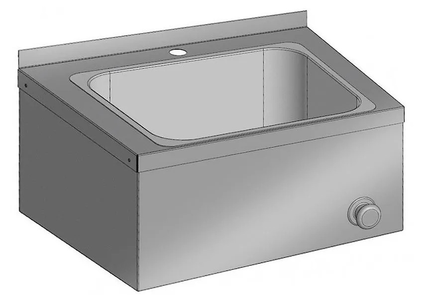 Рукомойник настенный, 400х400х200, емкость 325х265х150: нерж. сталь марки AISI 304, толщина 0,8 мм., борт, отверстие под смеситель, в комплекте: кнопка бедренная подачи холодной воды, гусак, подводка гибкая для воды