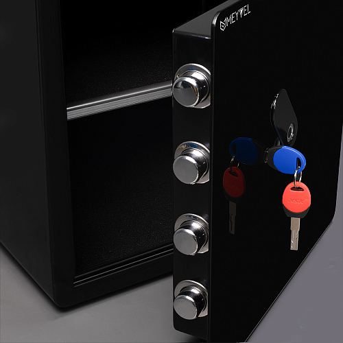 Использование самых последний технологий позволило создать максимально взломостойкий сейф в своём классе - Meyvel SF11-449-402 с корпусом, изготовленным из прочной стали и покрытой специальной износостойкой краской. Внутри расположен удобный коврик, а наличие электронной клавиатуры позволяет сделать управление сейфом максимально комфортным. Запирание/открытие сейфа можно осуществить как при помощи кода от 4 до 6 цифр, так и с помощью отпечатка пальца. SF11-449-402 имеет объём 54 литра, что делает её одной из самых вместительных в линейке сейфов Meyvel