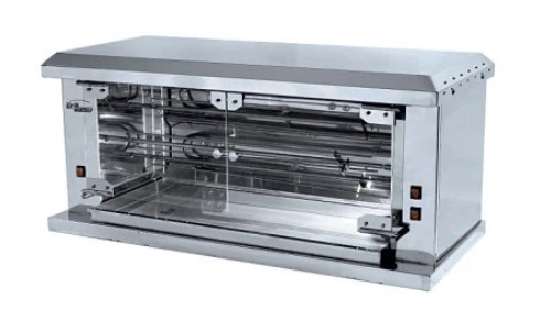 Все элементы шампурного электрического гриля выполнены из пищевой нержавеющей стали. Дверь и задняя стенка выполнены из термостойкого стекла. Безопасность эксплуатации гриля достигается за счет использования надежных итальянских кранов. Гриль рассчитан на приготовление 15 куриных тушек и оборудован стеклянными дверьми и задней стенкой, имеются корзины для кур из нержавеющей стали.