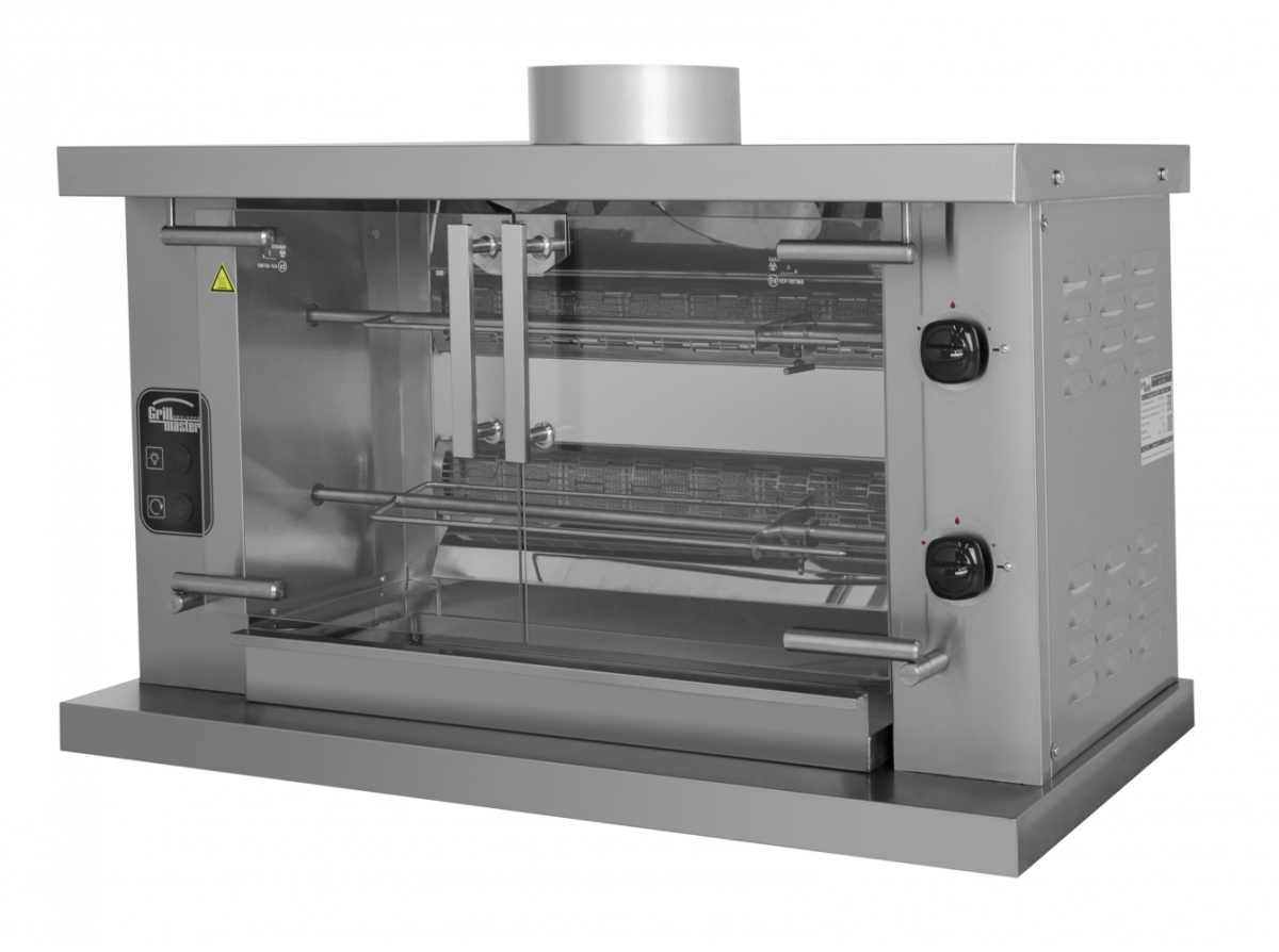 Рамная конструкция, цепная передача вращения шампуров, полный газ.контроль. Гриль на 6 тушек, 2 шампура, выполнен полностью из нержавеющей стали, готовит курицу за 55 минут