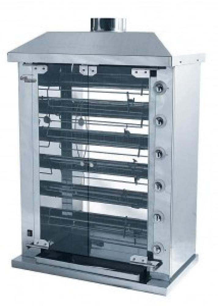 Рамная конструкция, цепная передача вращения шампуров, полный газ.контроль. Гриль на 55 тушек, 6 шампуров в первом ряду+5 шампуров во втором ряду, выполнен полностью из нержавеющей стали, готовит курицу за 55 минут, 6 газовых кранов с ситемой газ-контроль