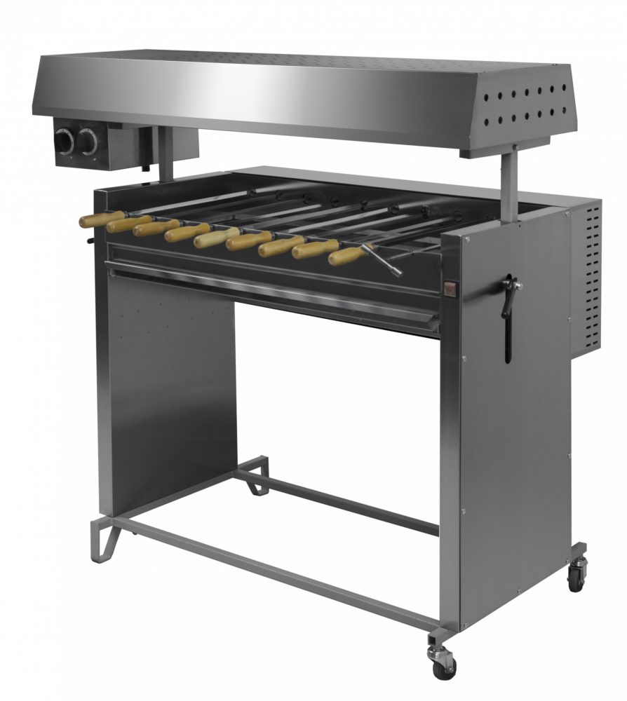 10 шампуров, подъемная крыша для регулировки степени тепловойобработки продуктов, 2 газовых крана с системой газ-контроль для защиты от утечек газа, плавная регулировка интенсивности горелок, электропривод всех шампуров, ручное вращение при отсутствии электричества, колеса для удобства перемещения шашлычницы, настроена на пропан