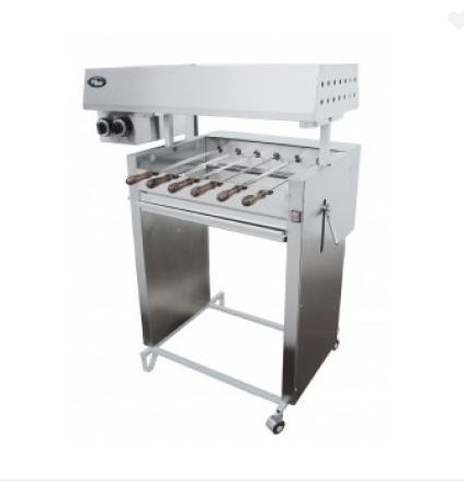 6 шампуров, подъемная крыша для регулировки степени тепловой обработки продуктов, 2 газовых крана с системой газ-контроль для защиты от утечек газа, плавная регулировка интенсивности горелок, электропривод всех шампуров, ручное вращение при отсутствии электричества, колеса для удобства перемещения шашлычницы.