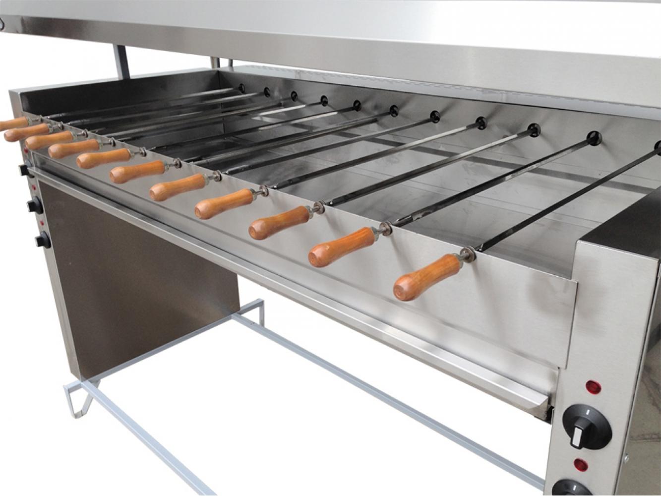 11 шампуров, подъемная крыша, регулирующая уровень тепловой обработки продукта, автоматическое вращение шампуров, колеса со стопорами, полностью из нержавеющей стали, 380В