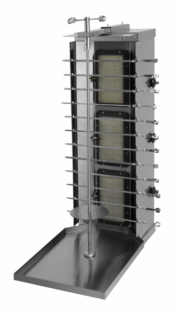 3 горелки с ситемой газ-контроль, производительность до 80 кг/мяса, 12 шампуров для шашлыка, газ-контроль, поддон для мяса, полностью из нержавеющей стали, настроена на пропан.