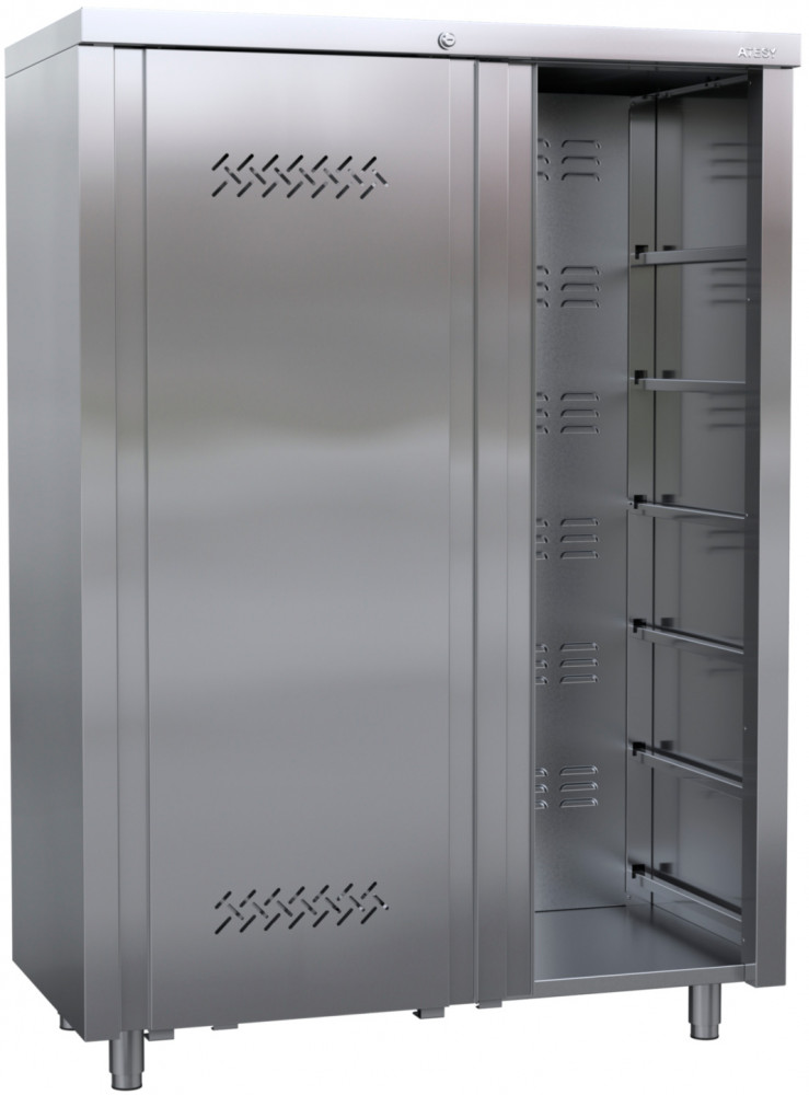 Шкаф для хлеба Atesy ШЗХ-С-1500.600-02-К (без полок) предназначен для хранения хлеба и хлебобулочных изделий в пекарнях, магазинах, кафе, фаст-фудах на предприятиях общественного питания и торговли. Модель оснащена дверями-купе с перфорацией и замком. Корпус выполнен из нержавеющей стали AISI 430, полки - из древесины.