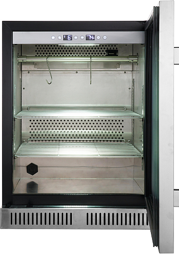 Шкаф для созревания мяса Meatage LUX SN-125 используется на предприятиях общественного питания и торговли, а также в домашних условиях для охлаждения, хранения и вызревания мяса, ветчины и салями. Дверь модели выполнена из трехслойного анти-УФ стекла, позволяющего лучше сохранять температуру в камере и наблюдать за процессом созревания мяса без нарушения микроклимата в шкафу. Воздух внутри стерилизуется УФ лампой и пропускается через угольный фильтр.