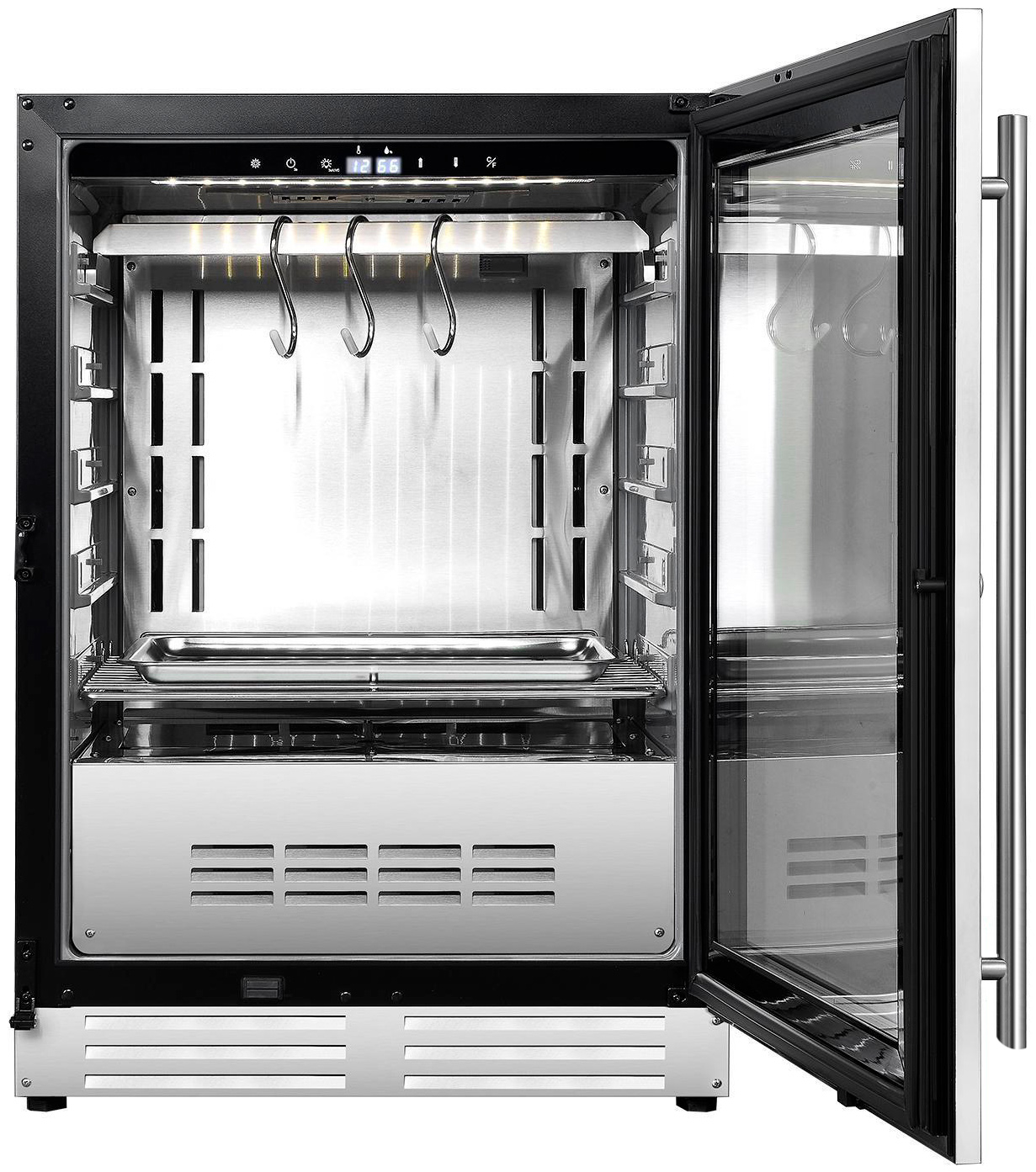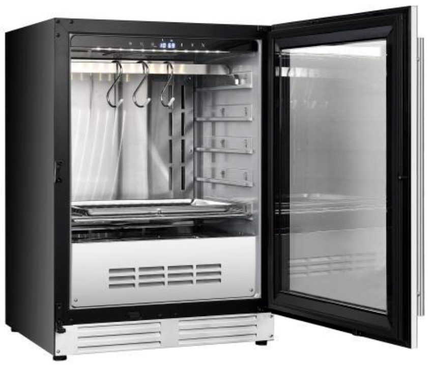 Корпус выполнен из крашенного металла, внутренние боковые стенки из ABS пластика, задняя стенка и полки из нержавеющей стали, а дверца - из ударопрочного закаленного стекла, благодаря чему можно наблюдать за процессом. Стильный дизайн, настройка параметров для вызревания — все это собрано в одном продукте. Клиент может быть уверен в качестве приобретаемого оборудования и получаемых стейков. Дизайн шкафа позволяет посетителям лично наблюдать процесс вызревания мяса и не оставит равнодушным даже искушенных гостей! Шкафы доступны как с функцией дополнительного увлажнения (модели WT), так и без нее.