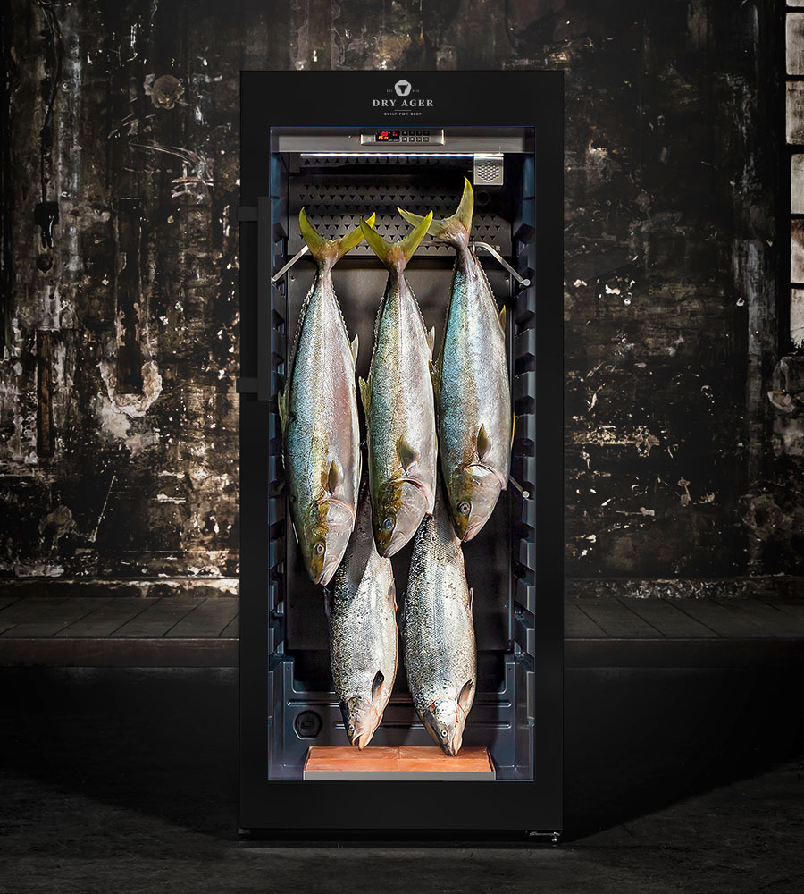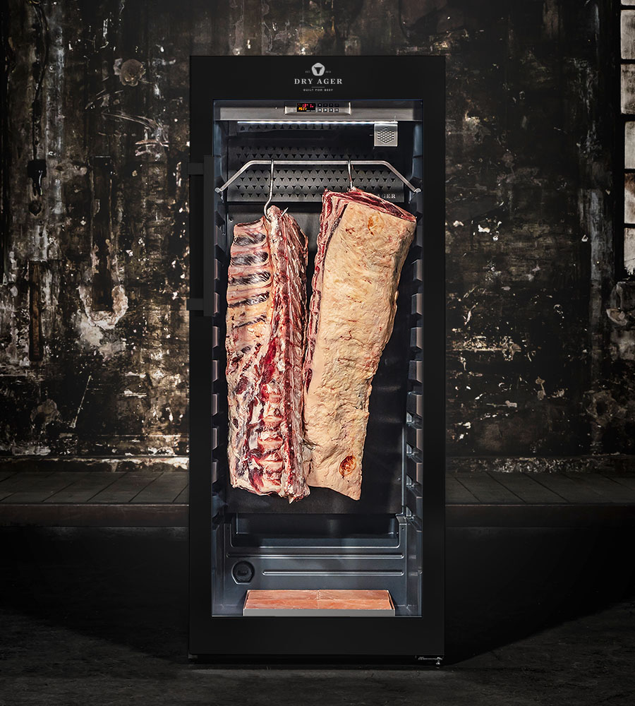 Шкаф для вызревания мяса DRY AGER DX 1000 Premium S Black Bundle, подсветка предназначен для сухого вызревания мяса, рыбы, сыров, для производства мясных закусок и колбасных изделий, ветчины, выдержки вина и сигар, сушки фруктов, овощей и макарон на предприятиях пищевой промышленности, общественного питания и торговли. Модель оснащена электронным контроллером температуры и влажности, откидным дном, интегрированными рейками и регулируемыми по высоте ножками. Корпус и дверная рама выполнены из нержавеющей стали, задняя стенка - из нержавеющей стали с черной матовой поверхностью, дверца - из стекла с УФ-фильтром.