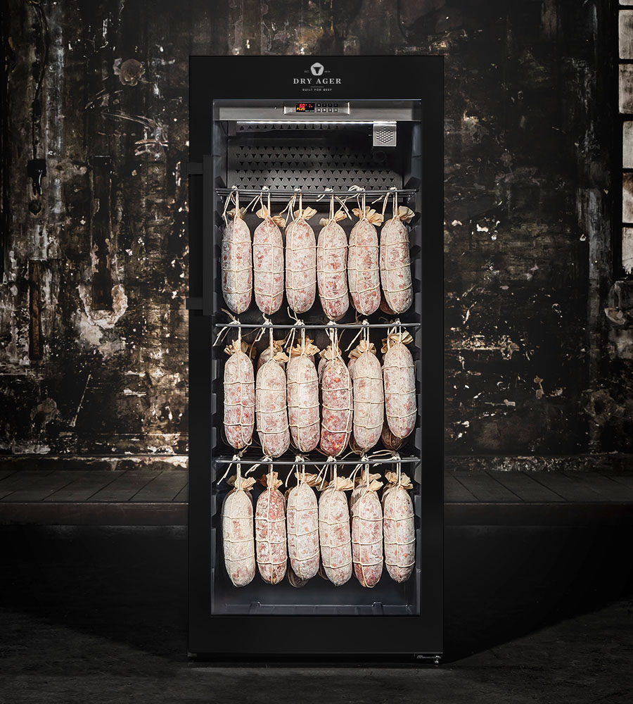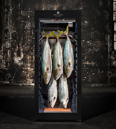 Шкаф для вызревания мяса DRY AGER DX 1000 Premium S Black Bundle предназначен для сухого вызревания мяса, рыбы, сыров, для производства мясных закусок и колбасных изделий, ветчины, выдержки вина и сигар, сушки фруктов, овощей и макарон на предприятиях пищевой промышленности, общественного питания и торговли. Модель оснащена электронным контроллером температуры и влажности, откидным дном, интегрированными рейками и регулируемыми по высоте ножками. Корпус и дверная рама выполнены из нержавеющей стали, задняя стенка - из черной стали с матовой поверхностью, дверца - из стекла с УФ-фильтром.
