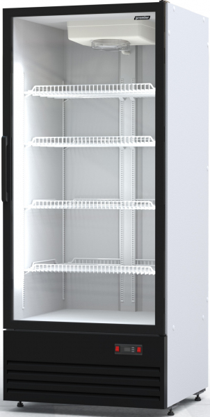 Модель оснащена стеклянной распашной дверью с доводчиком и 5 регулируемыми полками с ценниками. Двери выполнены из энергосберегающего стеклопакета.