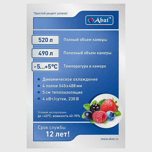 Камера холодильного шкафа вмещает 4 полки решетчатой структуры, размеры которых составляют 545х 488 мм. Каждая полка рассчитана на размещение примерно 40 кг продуктов. Охлаждение камеры холодильного шкафа осуществляется на безопасном хладагенте - фреоне R404а. Шкаф холодильный является универсальным холодильным оборудованием. Охлаждение продуктов может вестись как при плюсовой, так и при минусовой температуре, поэтому, в зависимости от особенностей вашего предприятия, вы можете либо охлаждать, либо замораживать продукты. Диапазон температур в камере варьируется от -5 до +5°С. Оттайка осуществляется автоматически с помощью ТЭНа оттайки.