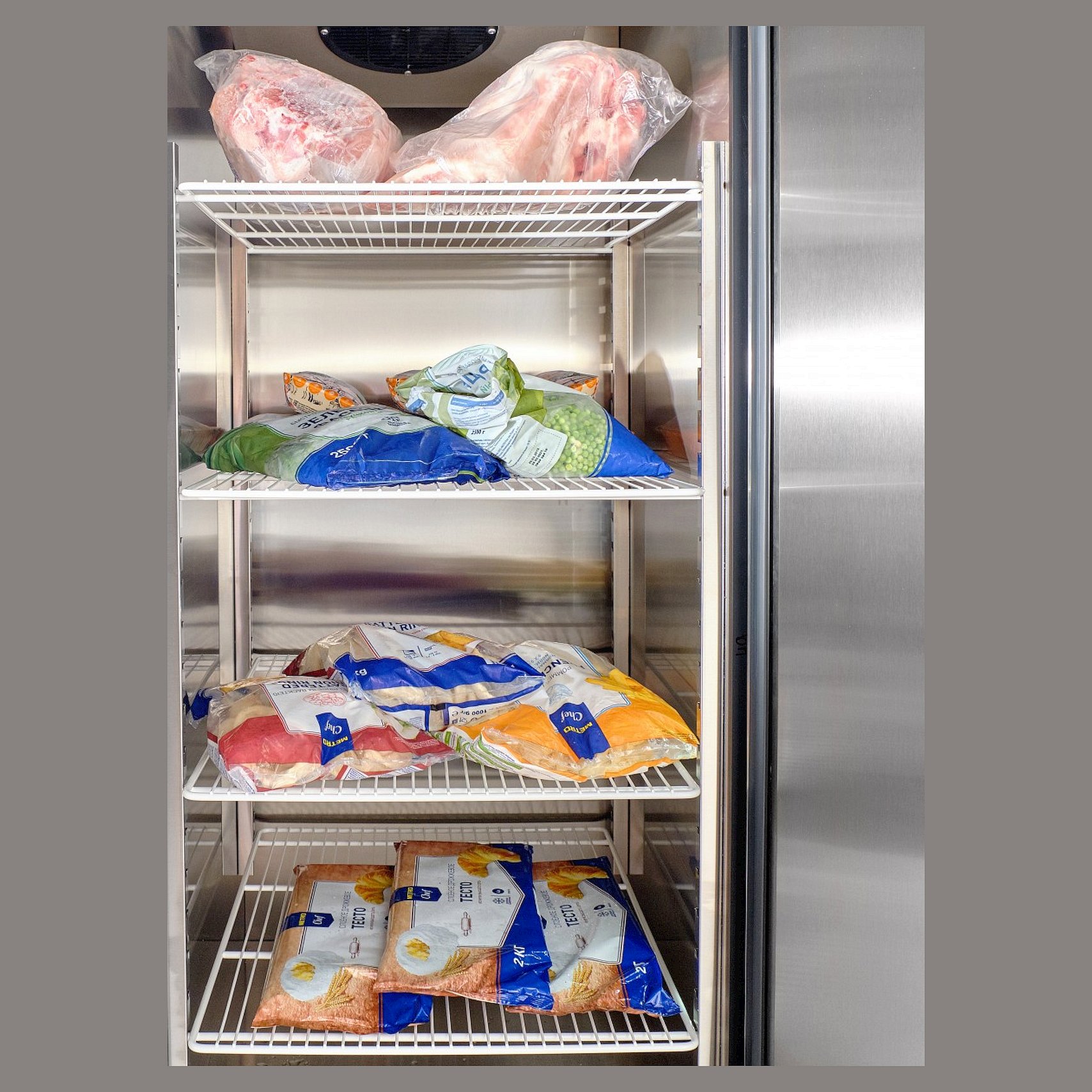 Оснащён воздухоохладителем с вентилятором для равномерного распределения температуры внутри камеры. Верхнее расположение агрегата улучшает теплообменные свойства и облегчает обслуживание. Цельнозаливной пенополиуретаном корпус изготовлен из нержавеющей стали.