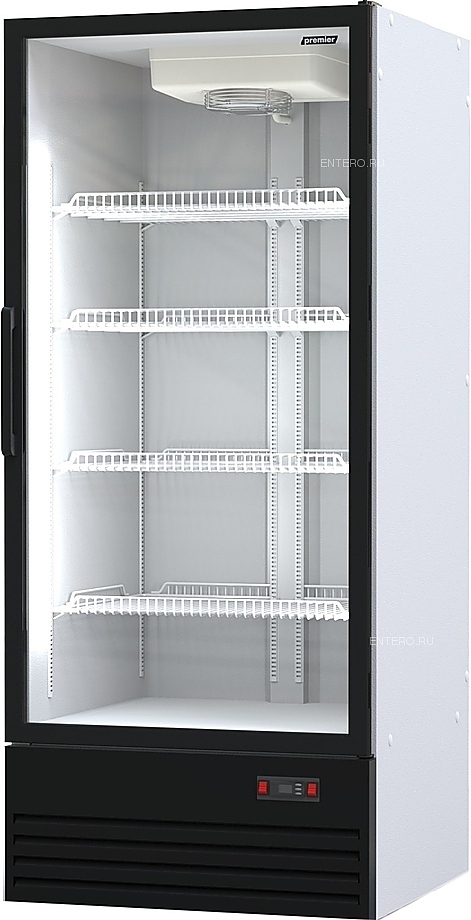Модель оснащена стеклянной распашной дверью с доводчиком и 5 регулируемыми полками с ценниками. Двери выполнены из энергосберегающего стеклопакета.
