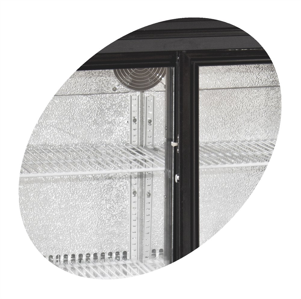 Панорамное стекло, металлические решетки и приятное на глаз современное LED освещение выгодно подчеркивают содержимое камеры. Ножки шкафа регулируются по высоте, что удобно для сглаживания неровностей. Внутренняя отделка выполнена из рифлёного алюминия. В холодильном контуре используется безопасный для окружающей среды хладагент - R600a.