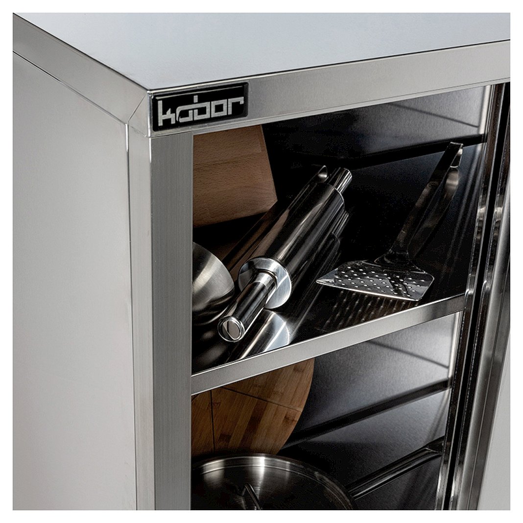 Шкаф кухонный изготовлен из нержавеющей стали. Внутри шкафа имеются три полки, которые можно крепить на различных уровнях. Ножки регулируются по высоте для устранения неровностей пола.
