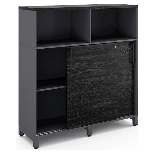 Шкаф открытый Kobor HK/2/1-120/60/M graphite/wood - cтильное и практичное решение для систем хранения. Открытый дизайн в комбинации цветов идеально подходит для зонирования пространства, хранения документов, литературы или демонстрации элементов корпоративного стиля.