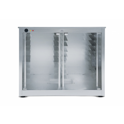 Корпус расстоечного шкафа выполнен из прочной нержавеющей стали. Две стеклянные дверцы не нагреваются при работе шкафа выше +40 °C, что гарантирует безопасную работу пекарей. Панель управления — механическая. Камера с универсальными направляющими рассчитана на загрузку 18 гастроемкостей размером GN 1/1 или противней 600х400 мм, что позволяет за один рабочий цикл обработать большое количество мелкоштучной мучной продукции, батонов, пиццы, кондитерских изделий.