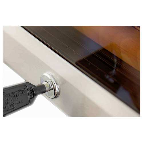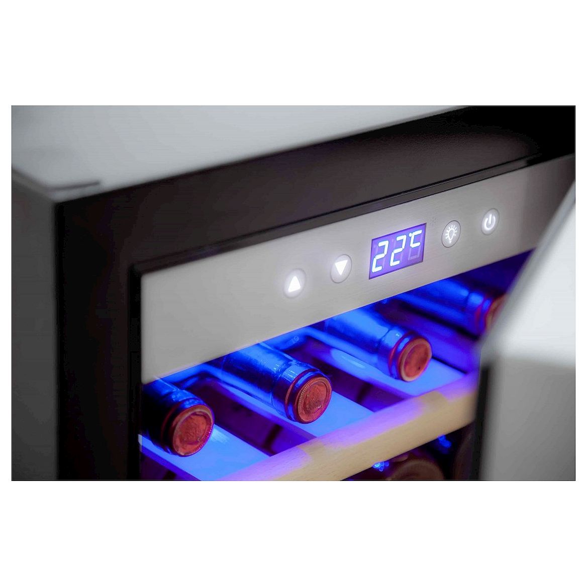 Модель оснащена встроенным вентилятором, 3 деревянными полками и голубой светодиодной подсветкой. Корпус выполнен из окрашенной в черный цвет стали, дверь со стальной рамой - из тонированного стеклопакета с защитой от УФ-излучения.