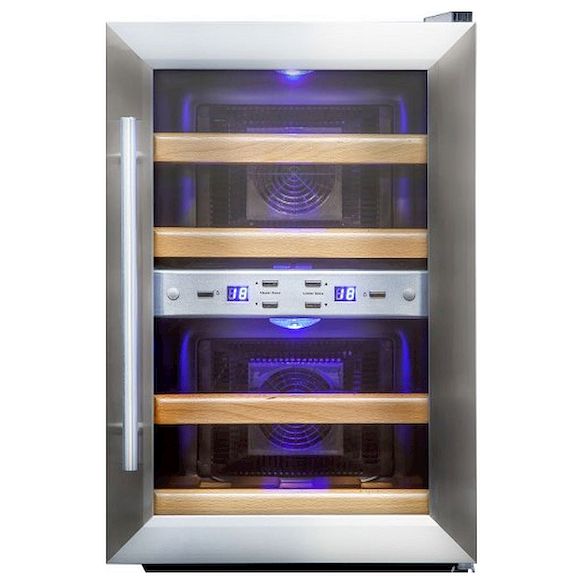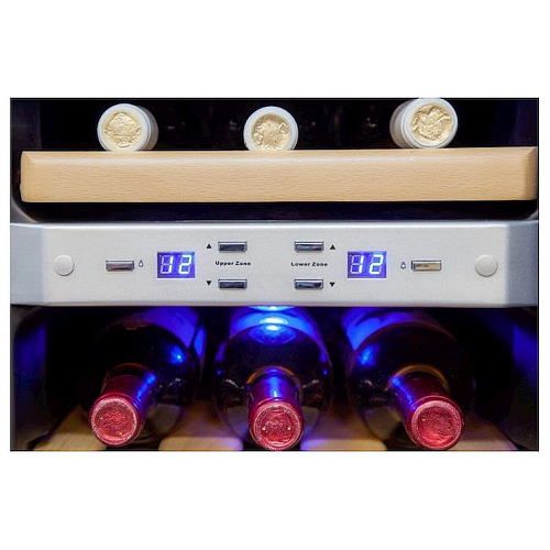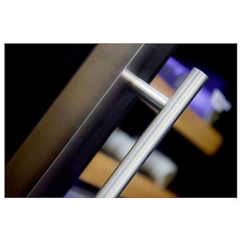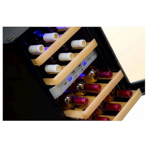 Модель оснащена встроенными вентиляторами для каждой зоны, 4 деревянными полками, голубой светодиодной подсветкой и регулируемыми ножками. Корпус выполнен из окрашенной в черный цвет стали, дверь в стальной раме - из прозрачного двойного стекла.