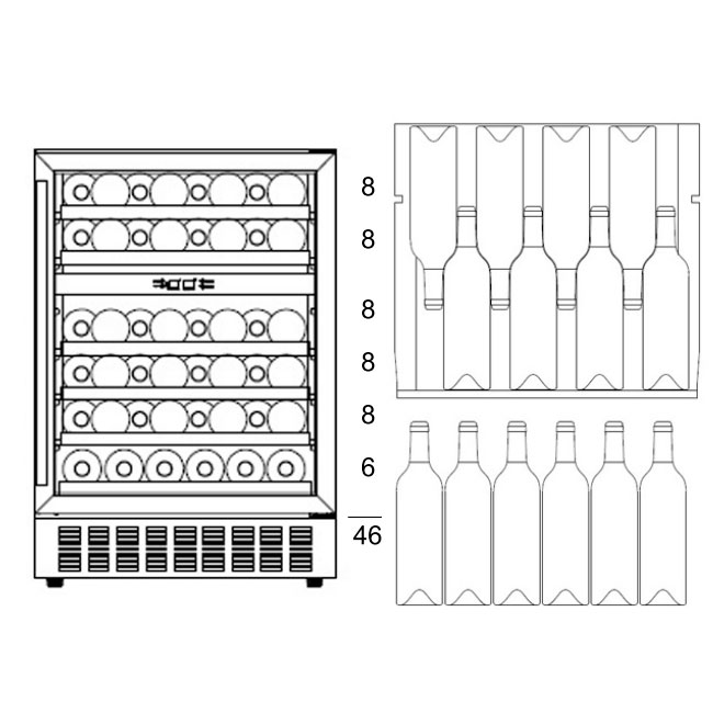 Винный шкаф устанавливается как отдельностоящий, так и встраиваемый под столешницу/в нишу, перенавешиваемая дверь выполнена в монолитной стальной раме чёрного цвета и имеет автодоводчик, материал корпуса и ручки нержавеющая сталь.