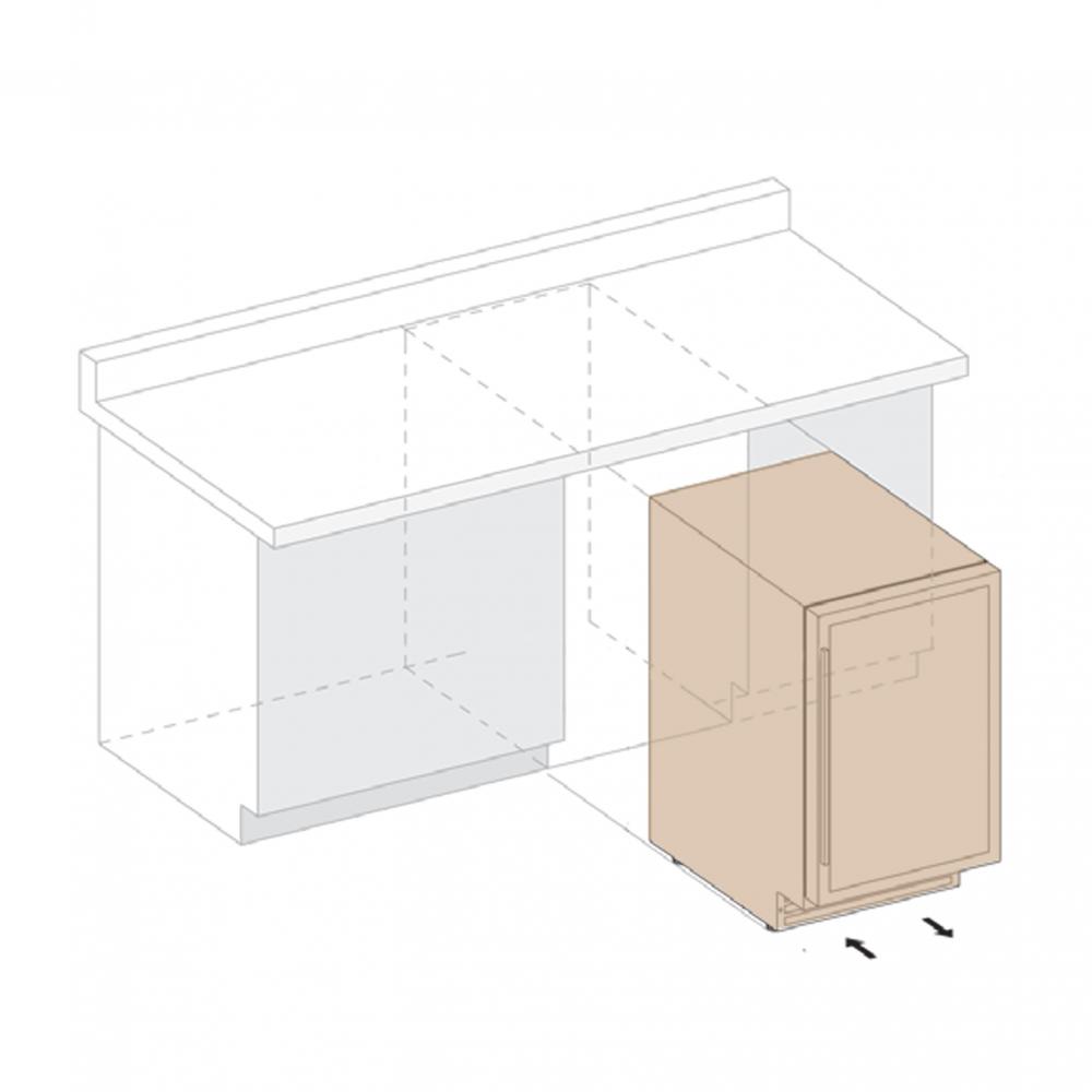 Винный шкаф устанавливается как отдельностоящий, так и встраиваемый под столешницу/в нишу, перенавешиваемая дверь выполнена в монолитной стальной раме чёрного цвета, материал корпуса и ручки нержавеющая сталь.