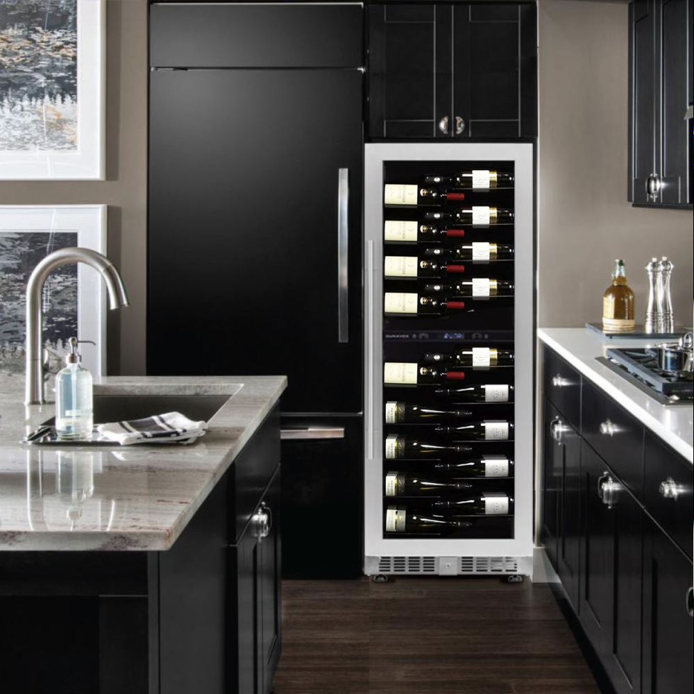 Шкаф винный Dunavox DX-104.375DSS предназначен для демонстрации, хранения и создания оптимальных условий для сохранения всех вкусовых свойств вина в бутылках на предприятиях общественного питания, торговли, в барах, ресторанах, специализированных магазинах, частных домах или квартирах. Модель оснащена сенсорной панелью управления, электронным термостатом, сигнализатором открытой двери и трехцветной LED-подсветкой (Red, Green, Blue) в каждой зоне. Корпус выполнен из окрашенного металла, дверь - из бесшовной нержавеющей стальной рамы и тонированного стекла с защитой от ультрафиолетовых лучей,полки - из пластифицированного металла, ручка двери - из стали.